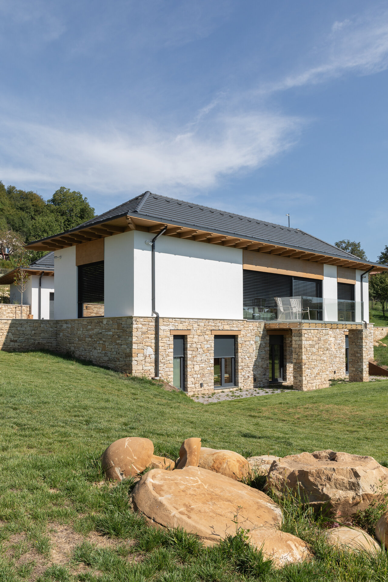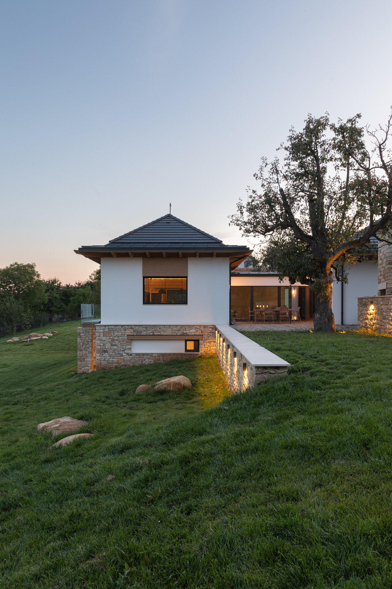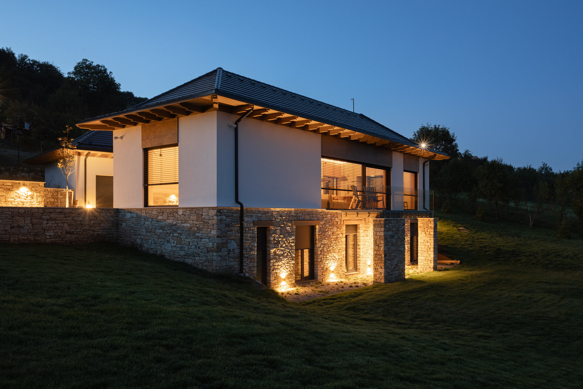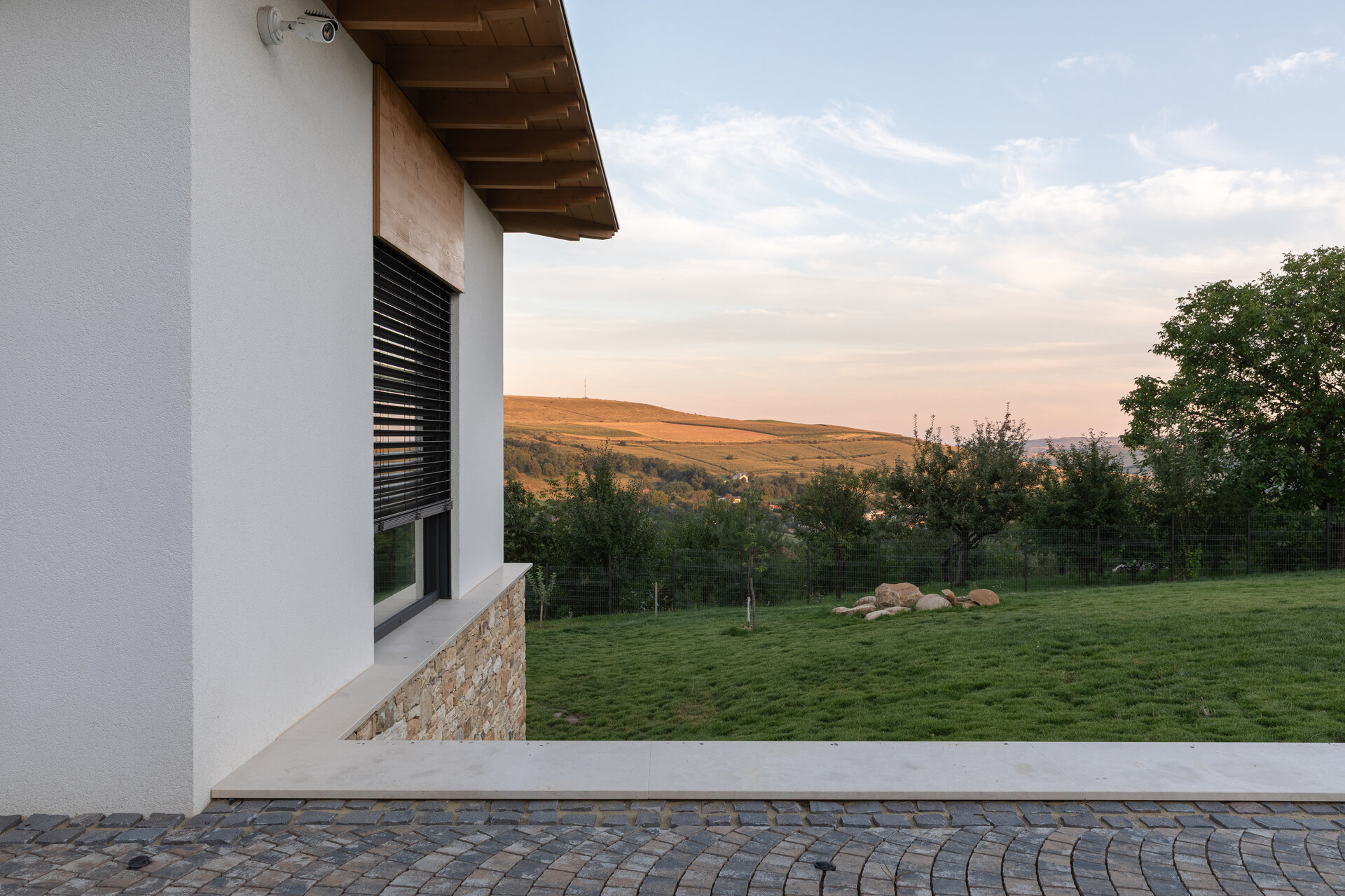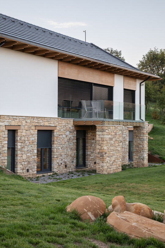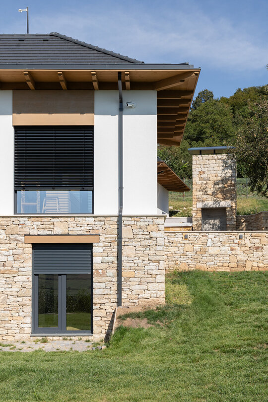 Casa se compune din două volume distincte, unite printr-un corp de legătură care se așază firesc pe panta dealului, integrându-se prin extensia soclului pietruit transformat în ziduri de sprijin. Volumele orientate către intrarea principală te invită înăuntru, într-o zonă mai introvertită, ce ascunde vitrajele ample aflate în spate. Spre curtea posterioară, aceleași volume devin mai închise, mai protectoare. Accesul, plin și opac, contrastează cu vitrajul din holul de intrare, care se deschide către terasa exterioară și către părul bătrân păstrat pe sit.