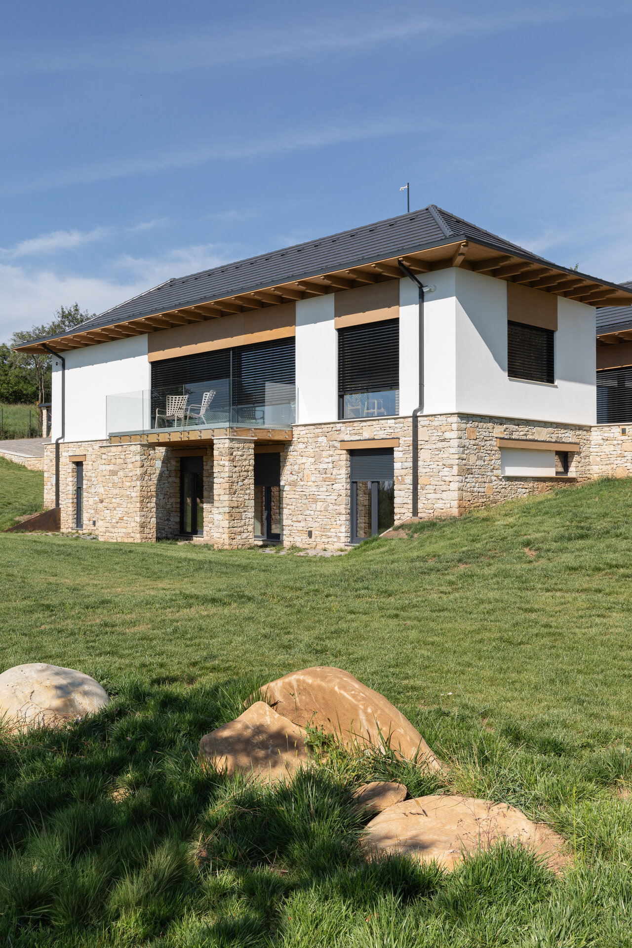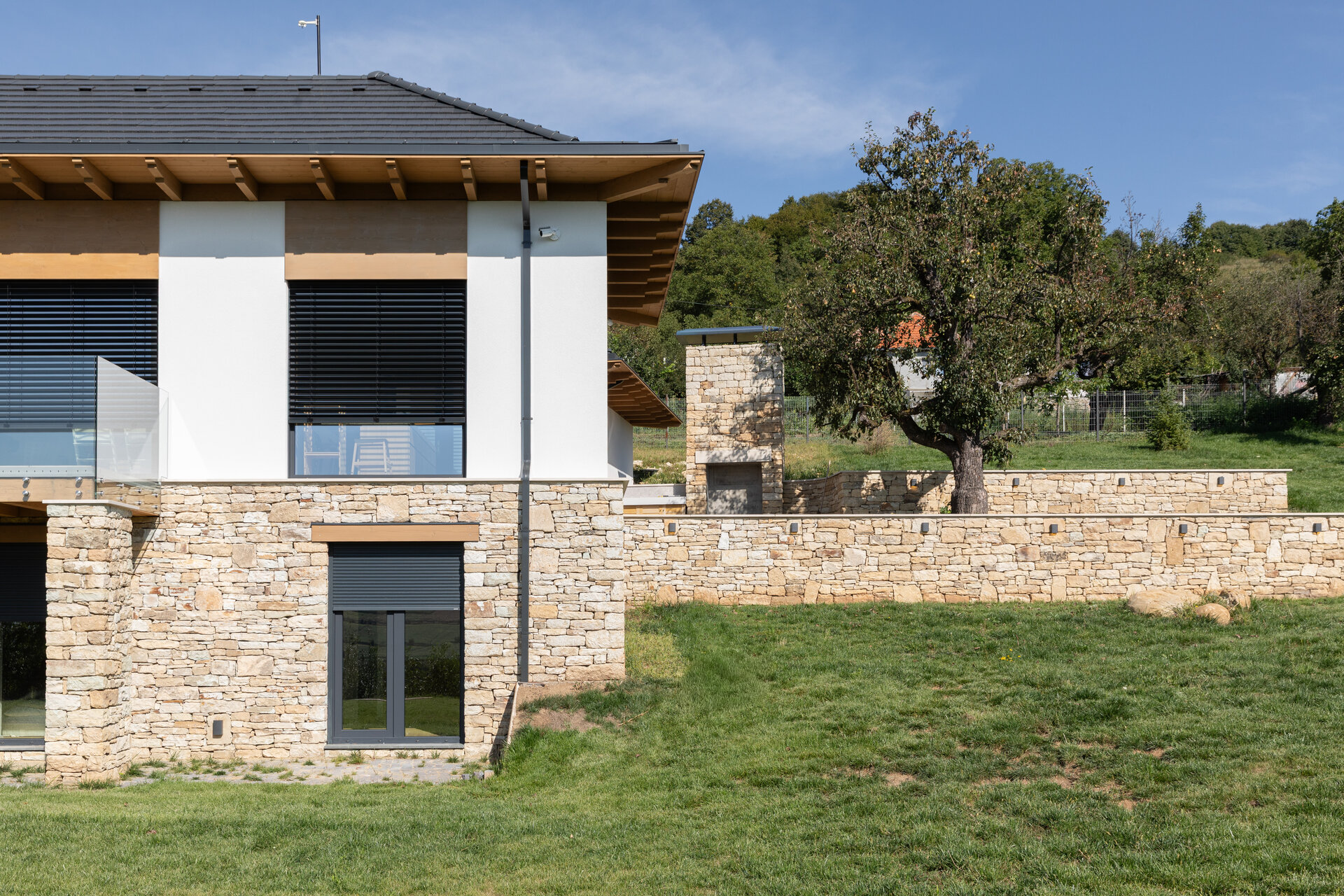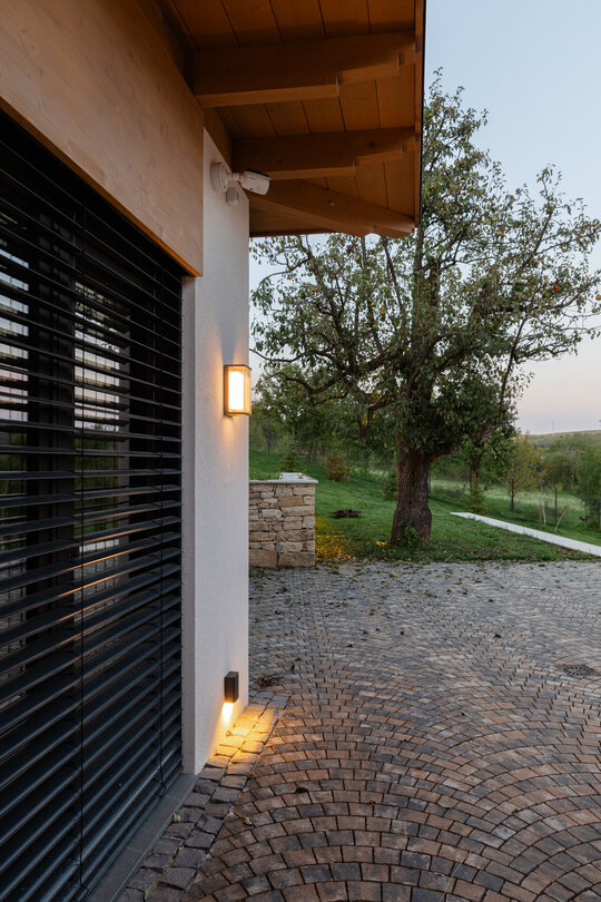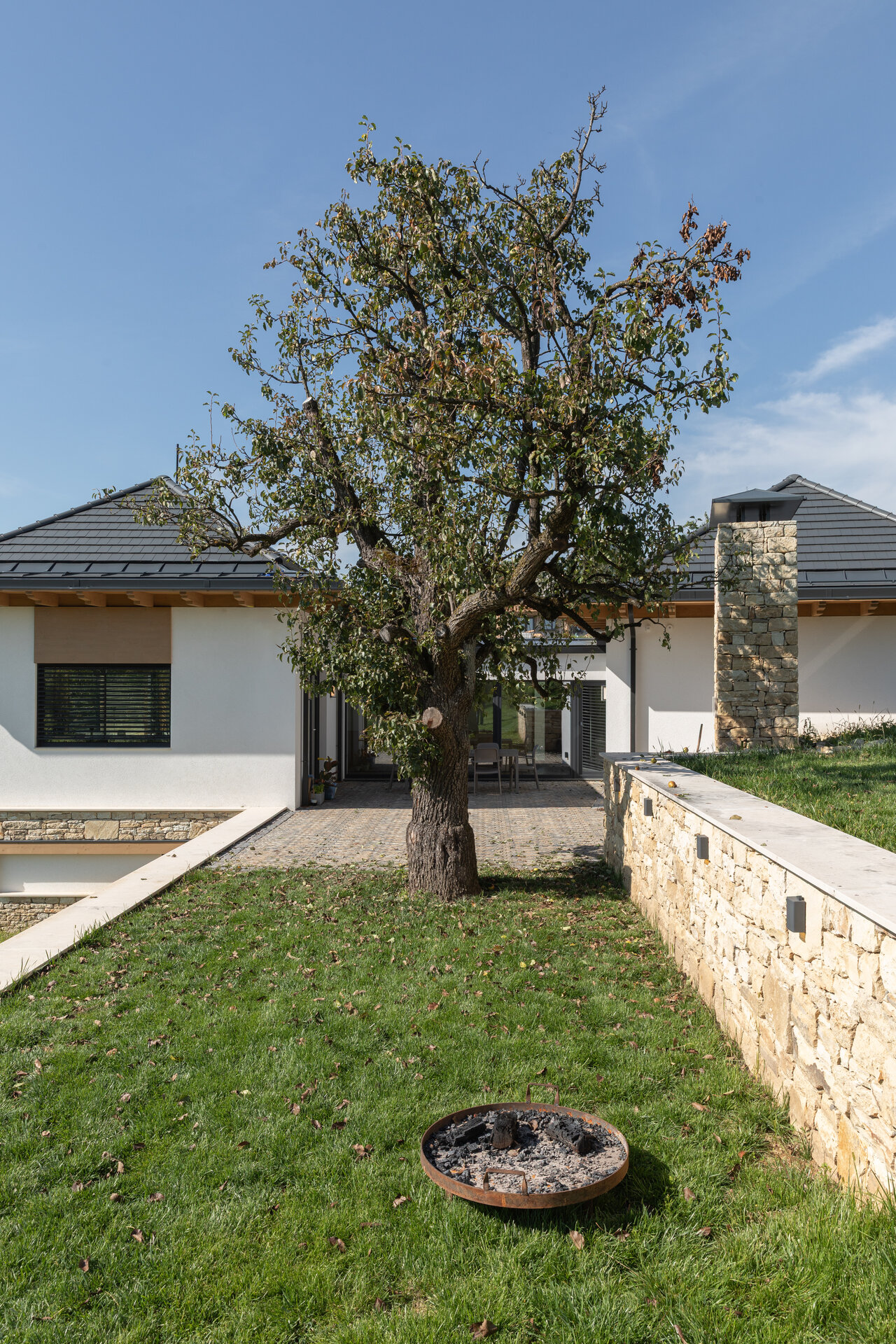 Casa se compune din două volume distincte, unite printr-un corp de legătură care se așază firesc pe panta dealului, integrându-se prin extensia soclului pietruit transformat în ziduri de sprijin. Volumele orientate către intrarea principală te invită înăuntru, într-o zonă mai introvertită, ce ascunde vitrajele ample aflate în spate. Spre curtea posterioară, aceleași volume devin mai închise, mai protectoare. Accesul, plin și opac, contrastează cu vitrajul din holul de intrare, care se deschide către terasa exterioară și către părul bătrân păstrat pe sit.