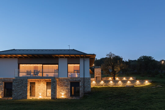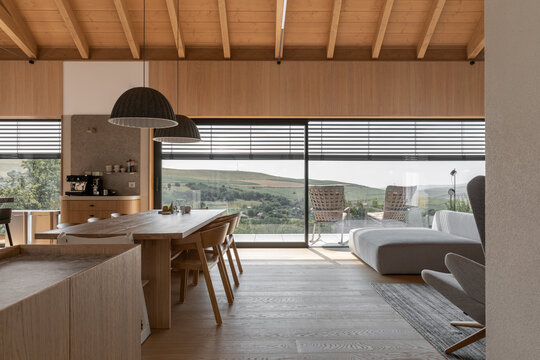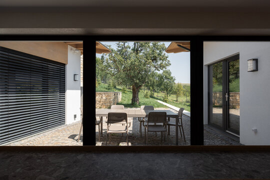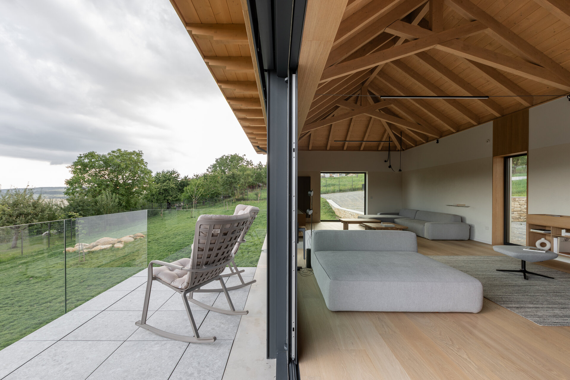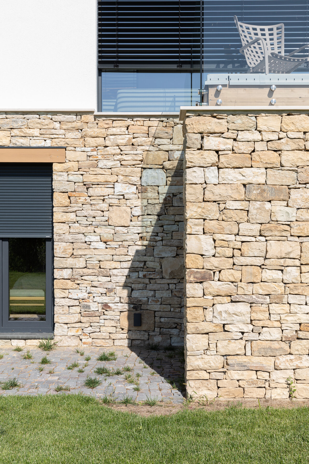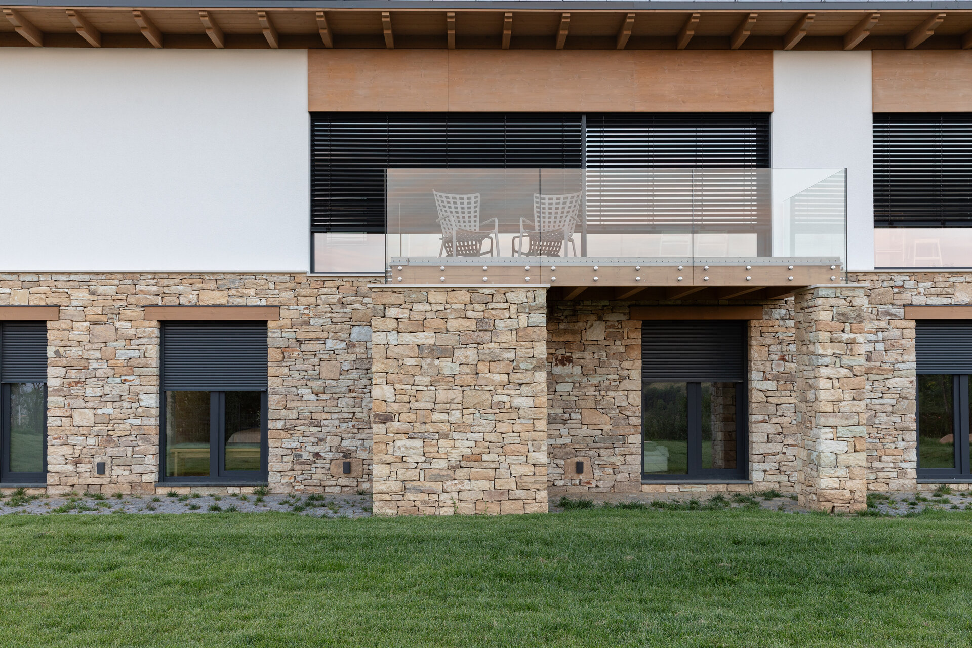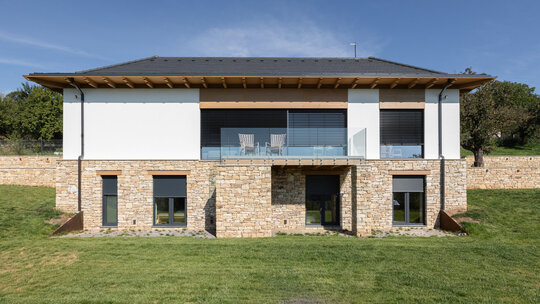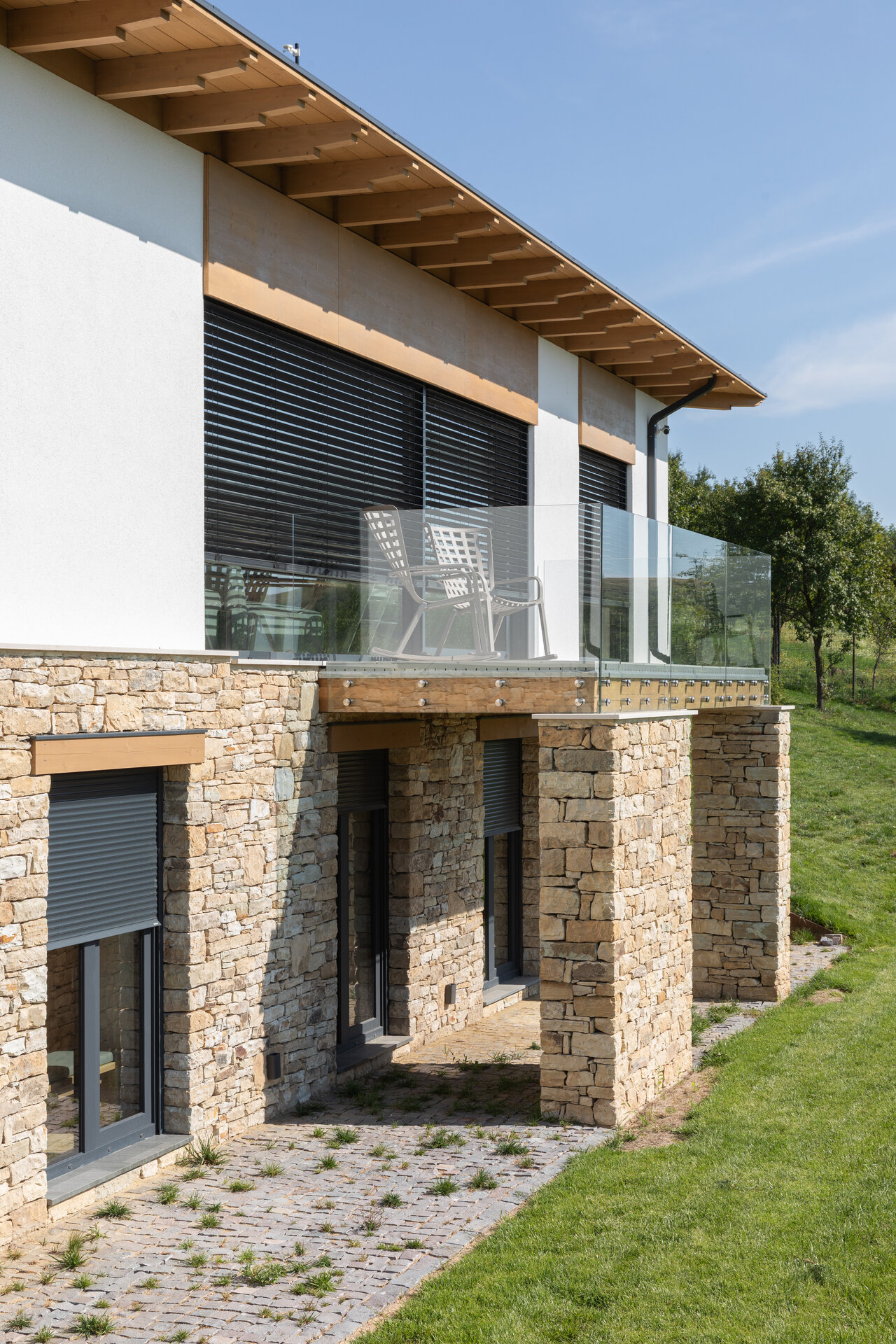 Casa se compune din două volume distincte, unite printr-un corp de legătură care se așază firesc pe panta dealului, integrându-se prin extensia soclului pietruit transformat în ziduri de sprijin. Volumele orientate către intrarea principală te invită înăuntru, într-o zonă mai introvertită, ce ascunde vitrajele ample aflate în spate. Spre curtea posterioară, aceleași volume devin mai închise, mai protectoare. Accesul, plin și opac, contrastează cu vitrajul din holul de intrare, care se deschide către terasa exterioară și către părul bătrân păstrat pe sit.