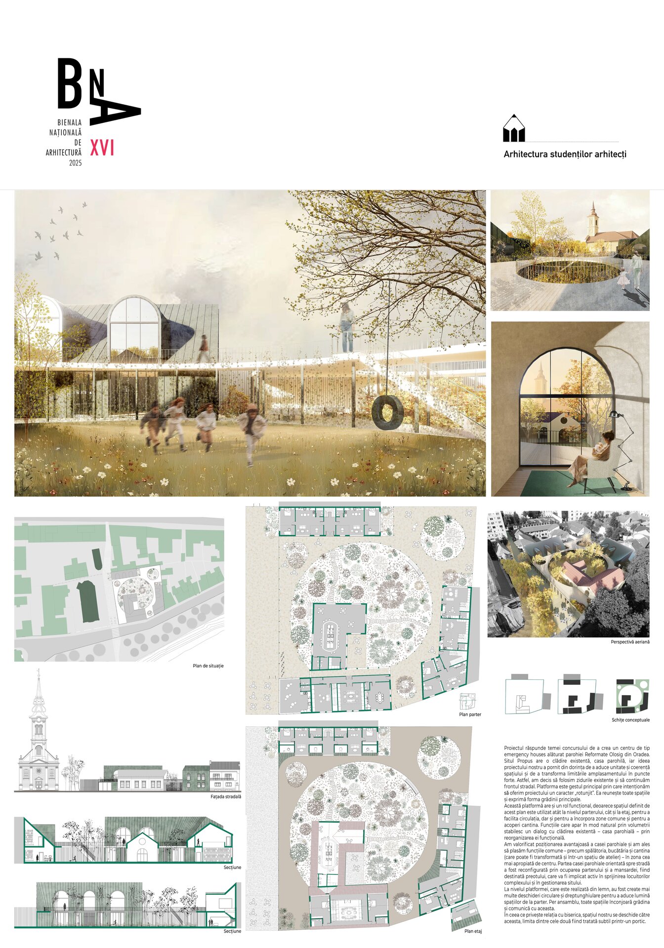 Proiectul răspunde temei concursului de a crea un centru de tip emergency houses alăturat parohiei Reformate Olosig din Oradea. Situl Propus are o clădire existentă, casa parohilă, iar ideea proiectului nostru a pornit din dorința de a aduce unitate și coerență spațiului și de a transforma limitările amplasamentului în puncte forte. Astfel, am decis să folosim zidurile existente și să continuăm frontul stradal. Platforma este gestul principal prin care intenționăm să oferim proiectului un caracter „rotunjit”. Ea reunește toate spațiile și exprimă forma grădinii principale.