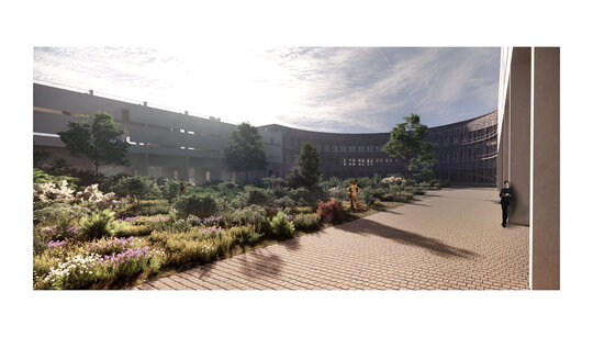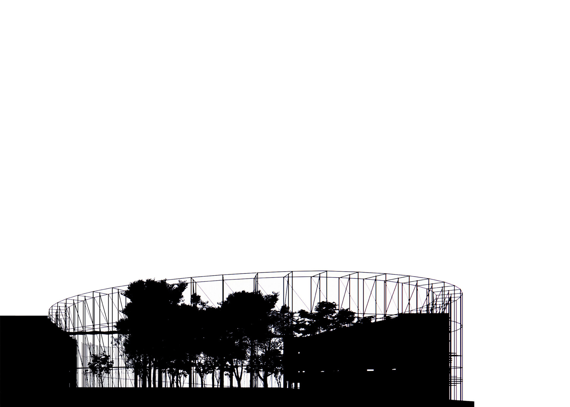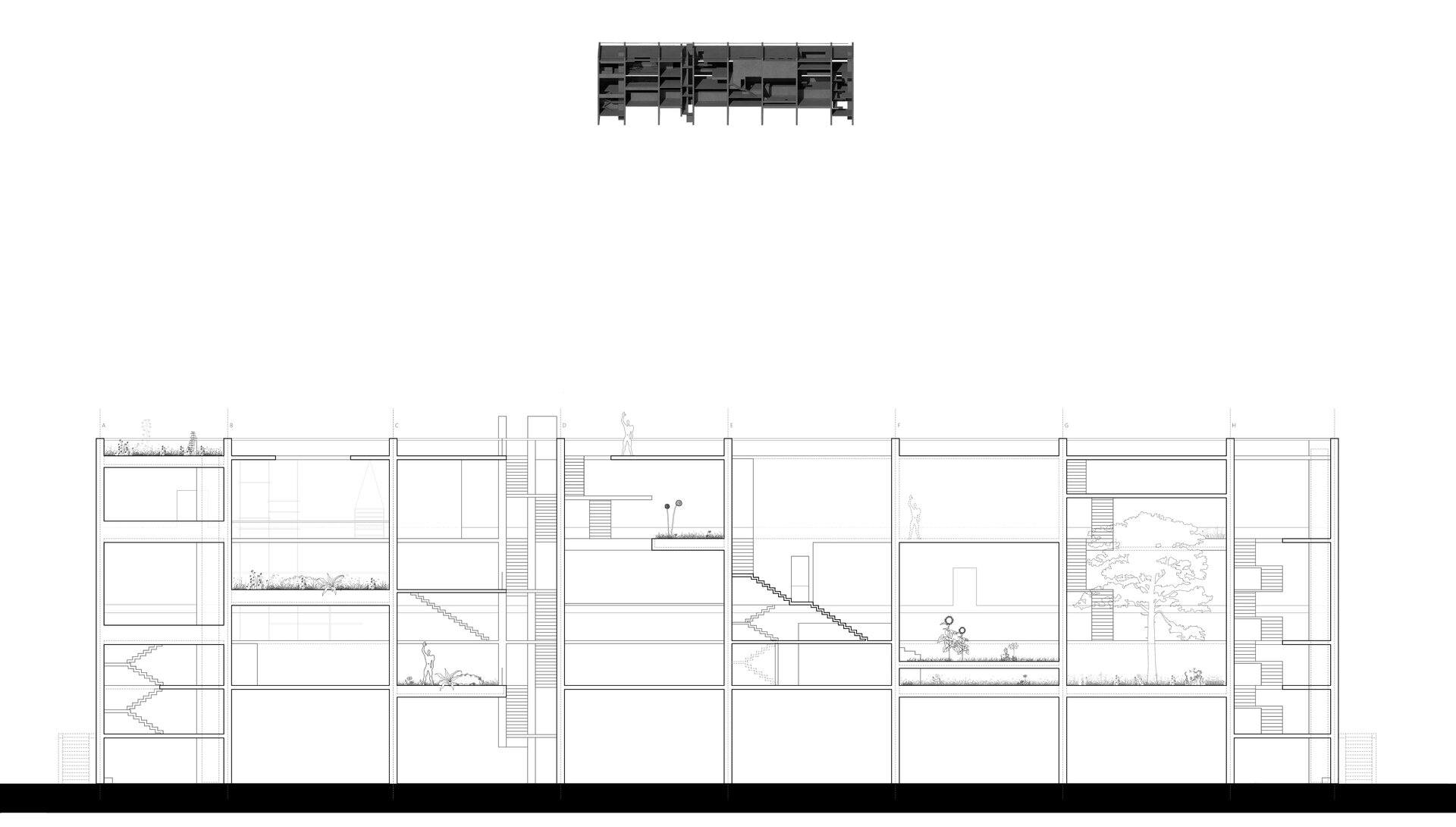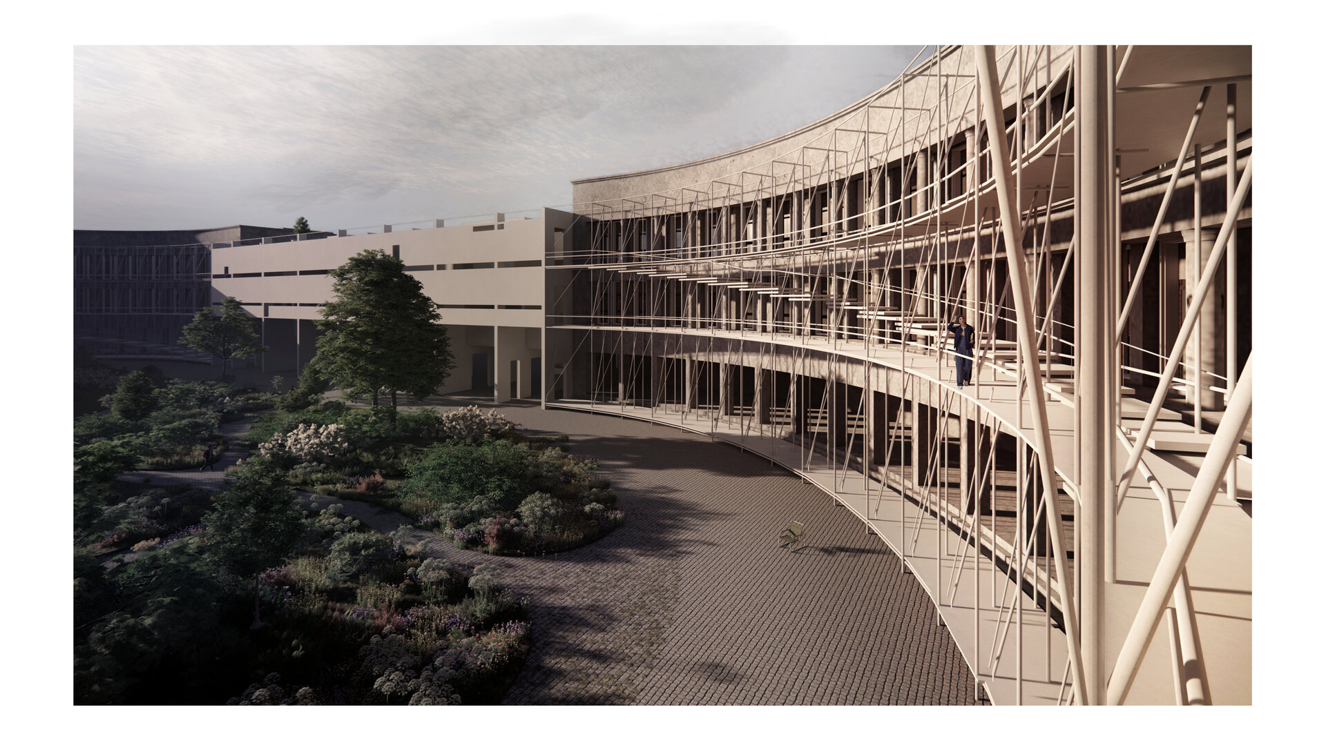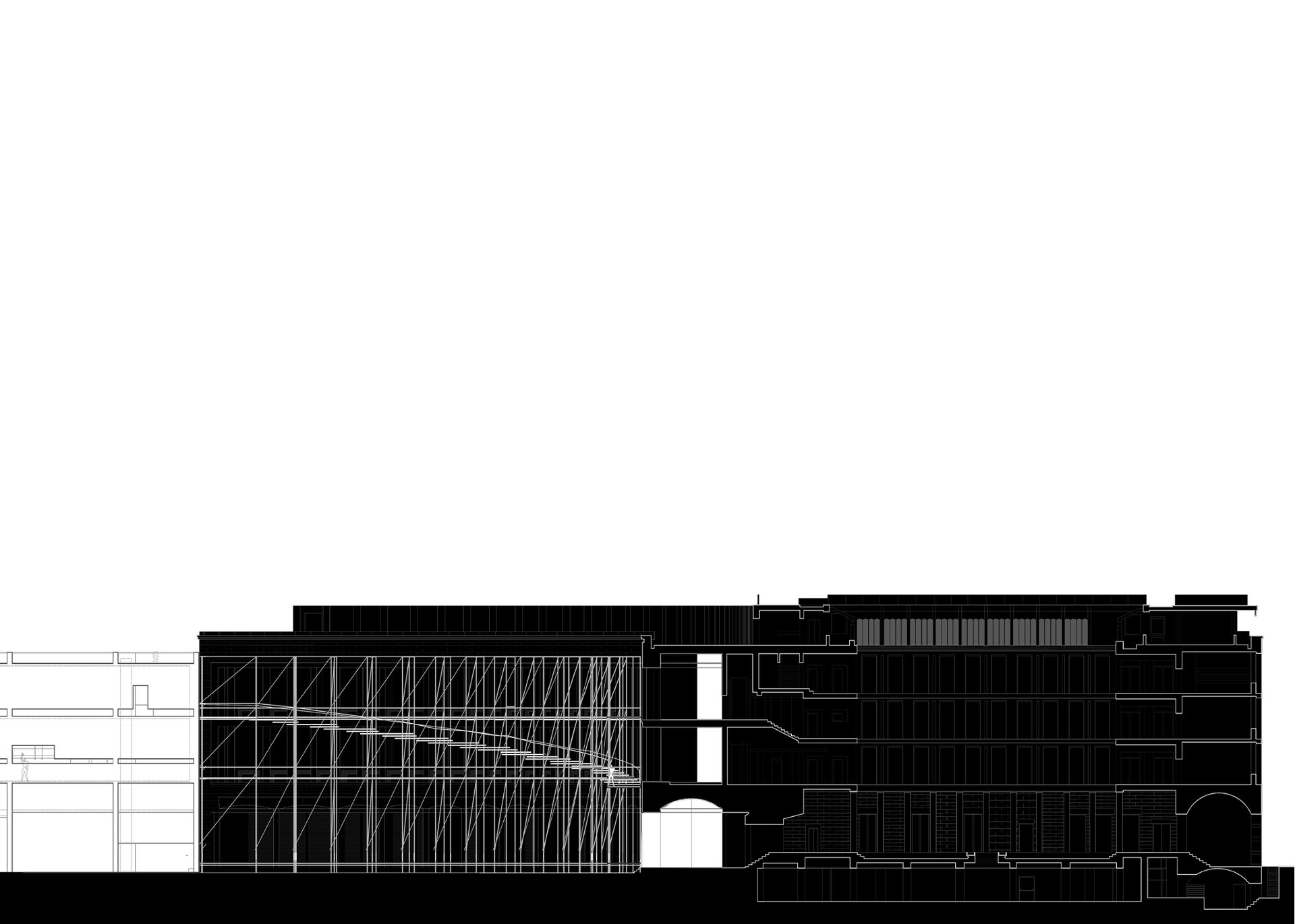 A doua structură reimaginează fațada interioară, folosind un limbaj arhitectural diferit de cel al primeia. Este alcătuită dintr-o structură metalică aeriană, ușoară, care integrează o scară desfășurată pe întreaga lungime a fațadei. Acest element nu doar creează o circulație verticală dinamică, ci și reface relația, mult timp neglijată, dintre curtea interioară și clădirile din jur, creând conexiuni pe toate nivelurile și stimulând permeabilitatea vizuală și fizică.