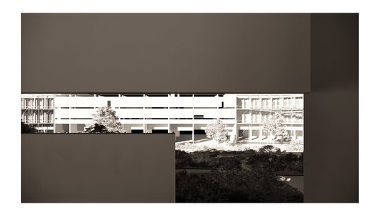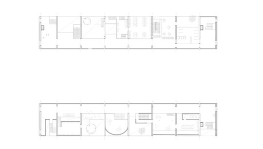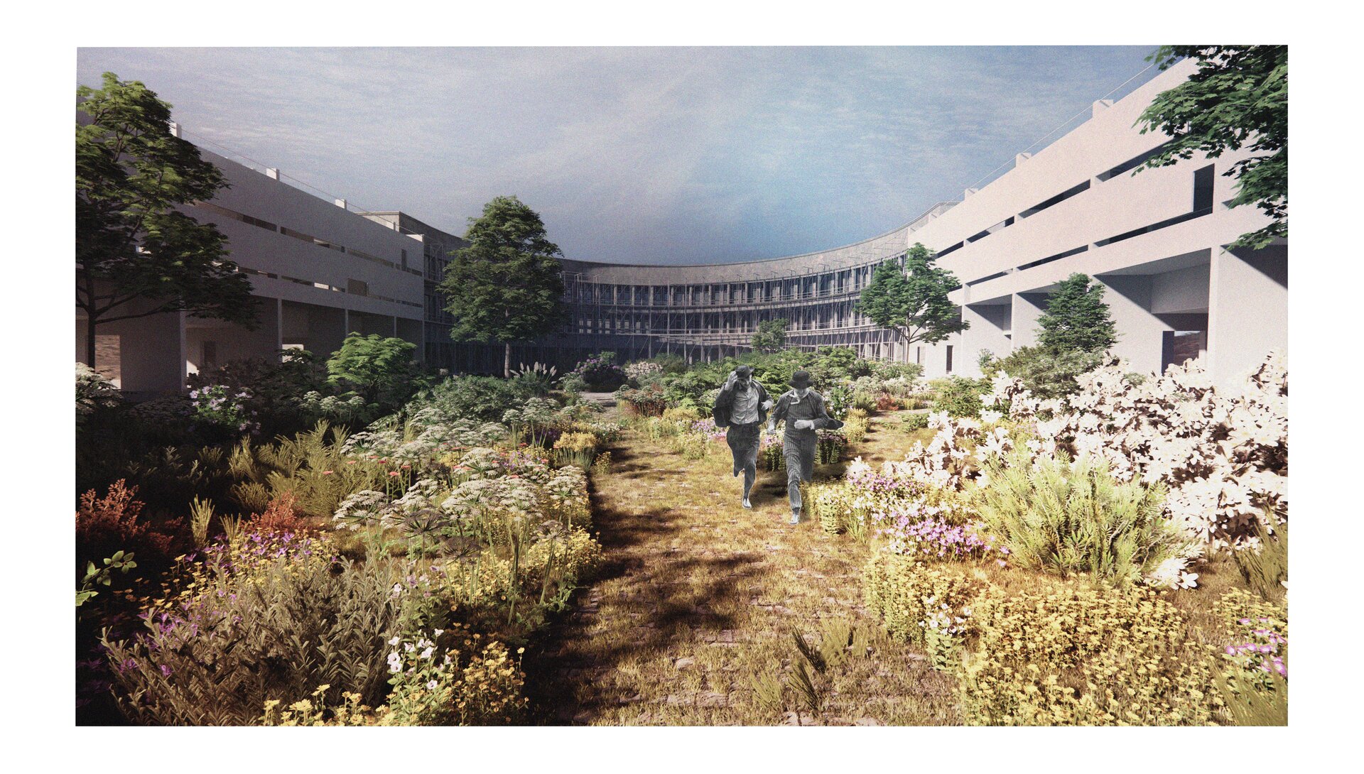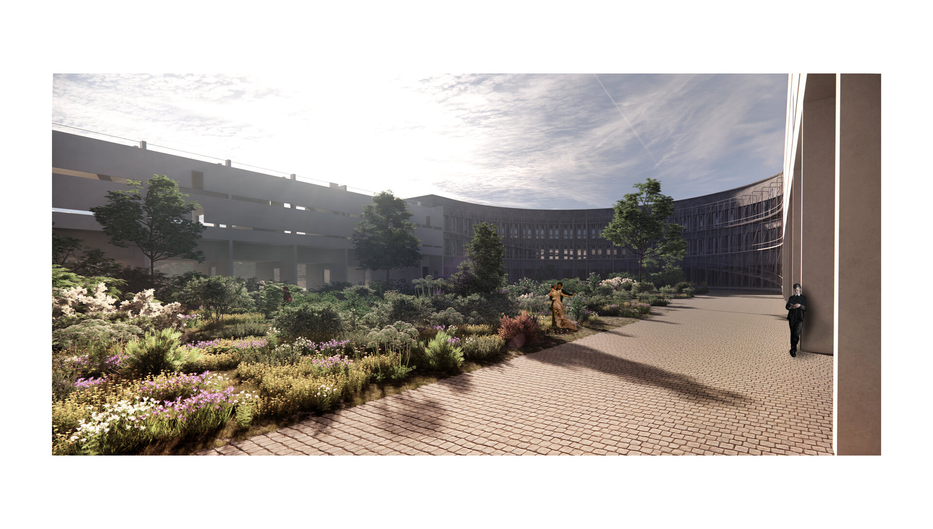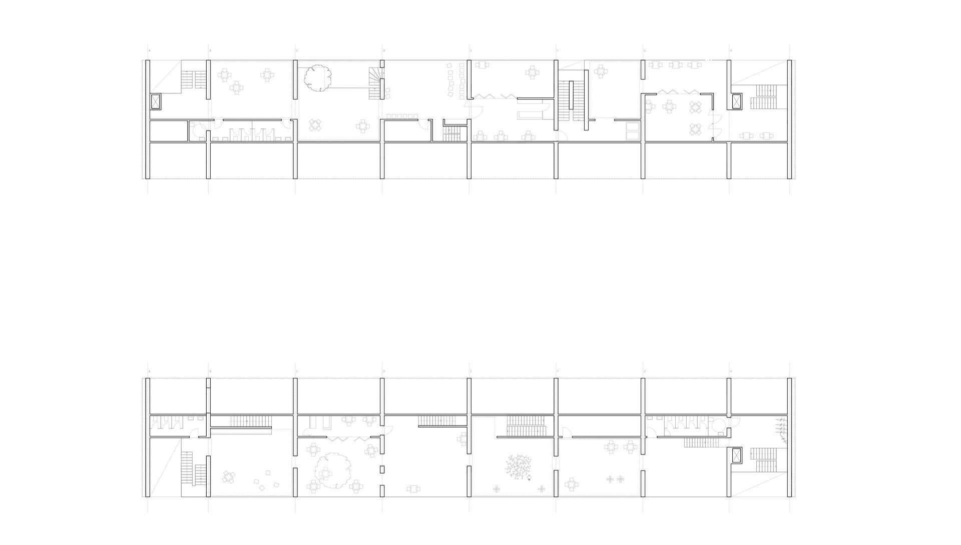 Prima dintre cele două structuri propuse este amplasată strategic între clădirile existente și este articulată printr-o succesiune de partiții structurale care găzduiesc o diversitate de „camere urbane” deschise: zone de lectură, spații verzi, platforme colaborative, zone de joc și agrement, precum și spații flexibile pentru evenimente culturale. Ele sunt concepute ca adevărați „condensatori sociali” — spații comunitare a căror absență s-a resimțit până acum în oraș — integrate într-un limbaj arhitectural complementar, ce păstrează densitatea existentă și adaugă un nou puls în inima cartierului.