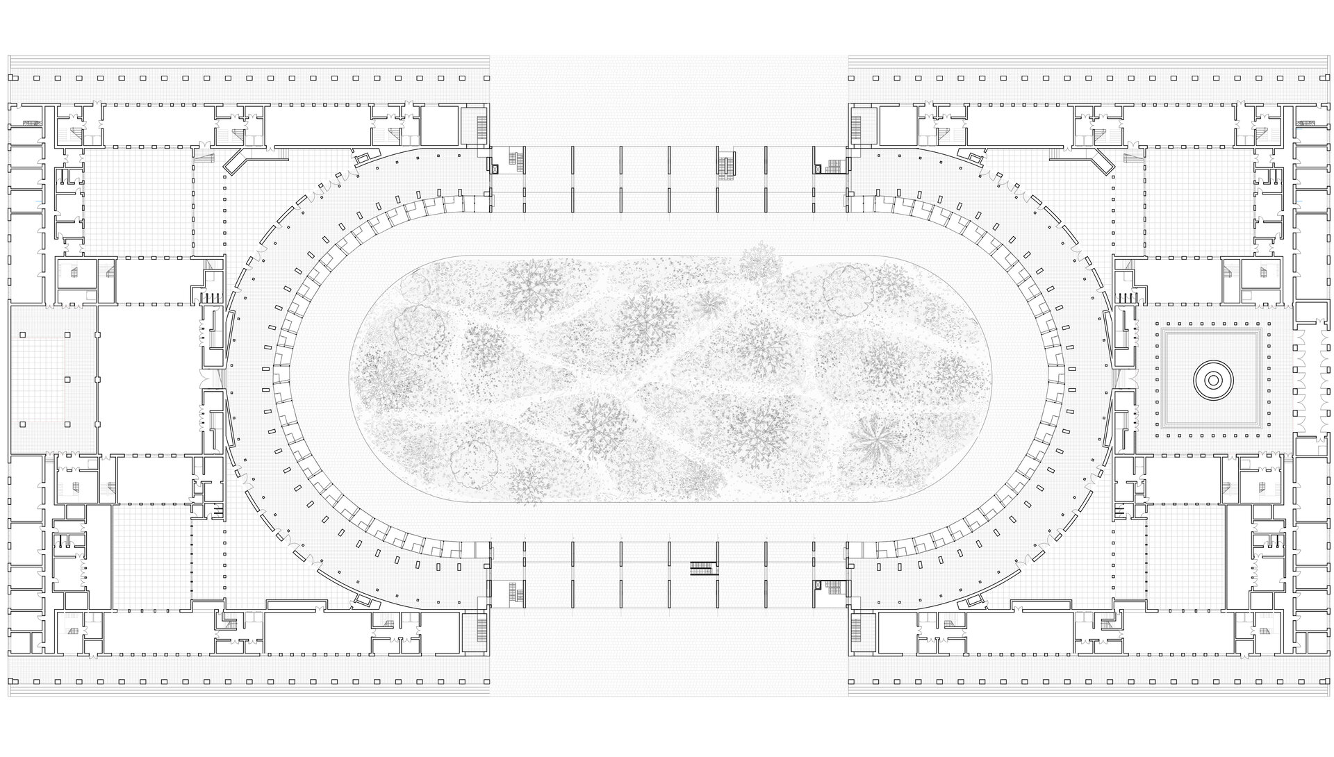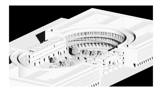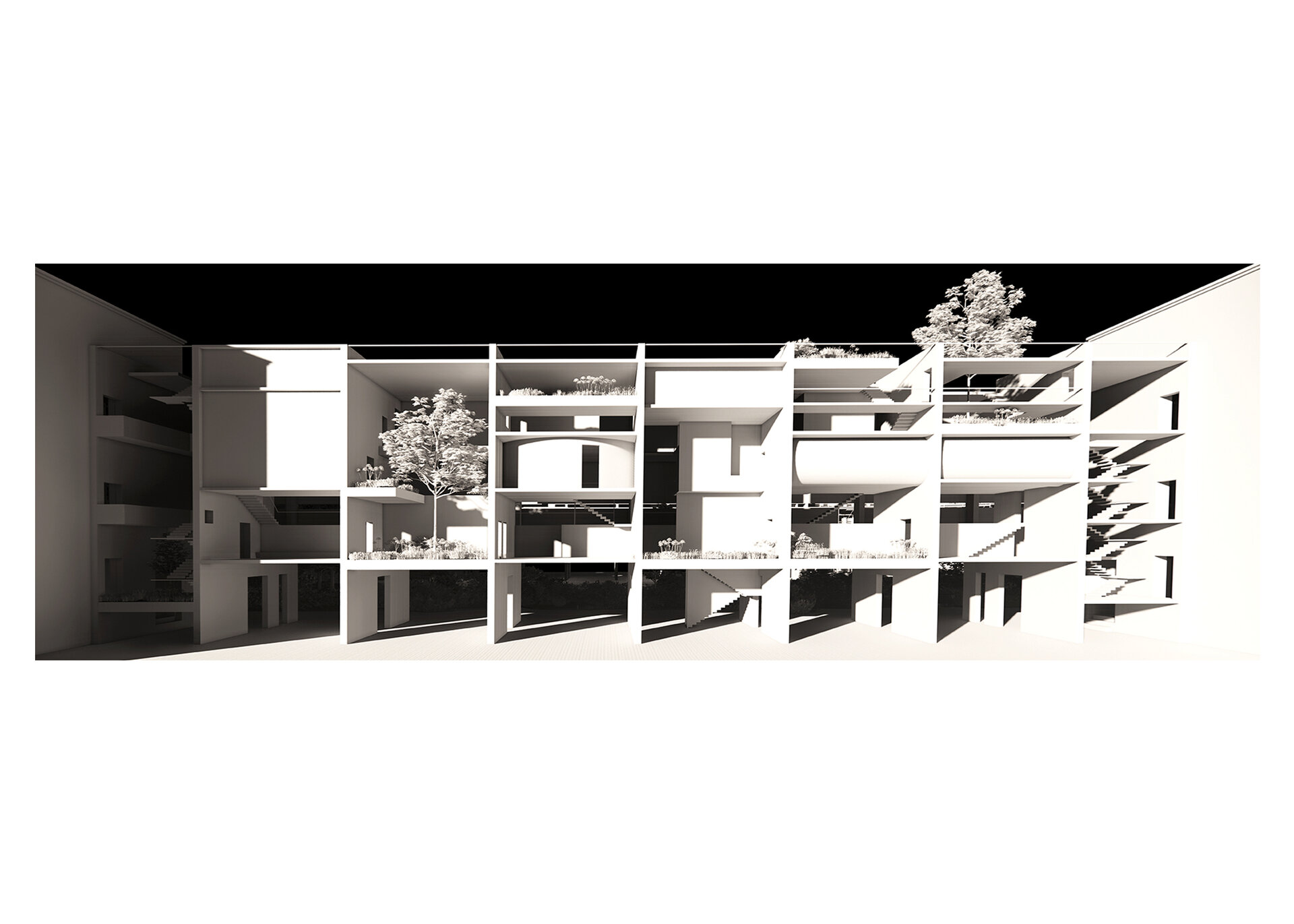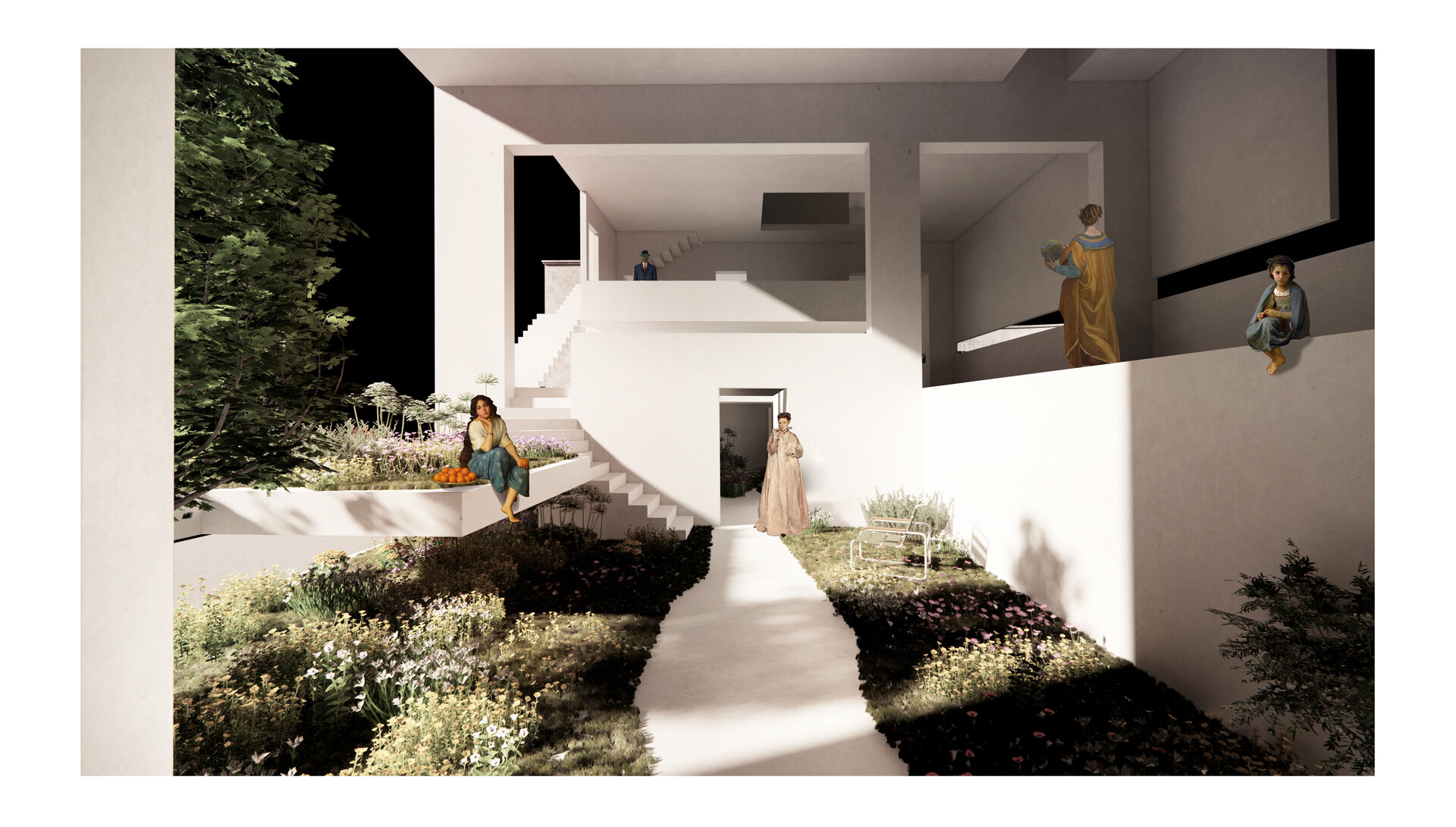 Prima etapă a analizei s-a concentrat pe reinterpretarea porticului nu doar ca spațiu tranzitoriu sau rezidual, ci ca oportunitate arhitecturală. Din această perspectivă a luat naștere o intervenție vizionară: crearea unui nou tip de portic, atașat celui existent, dar extins și pe verticală. Această extindere, pe care am numit-o „camere urbane”, transformă un gol perceput anterior ca fiind marginal și subevaluat într-un loc vibrant și semnificativ. Conceptul își extrage inspirația din lirismul abstract al artistului italian Fausto Melotti și din atmosferele onirice, ușor suprarealiste, prezente în cinematografia lui Federico Fellini, împletind arta, arhitectura și narațiunea spațială.