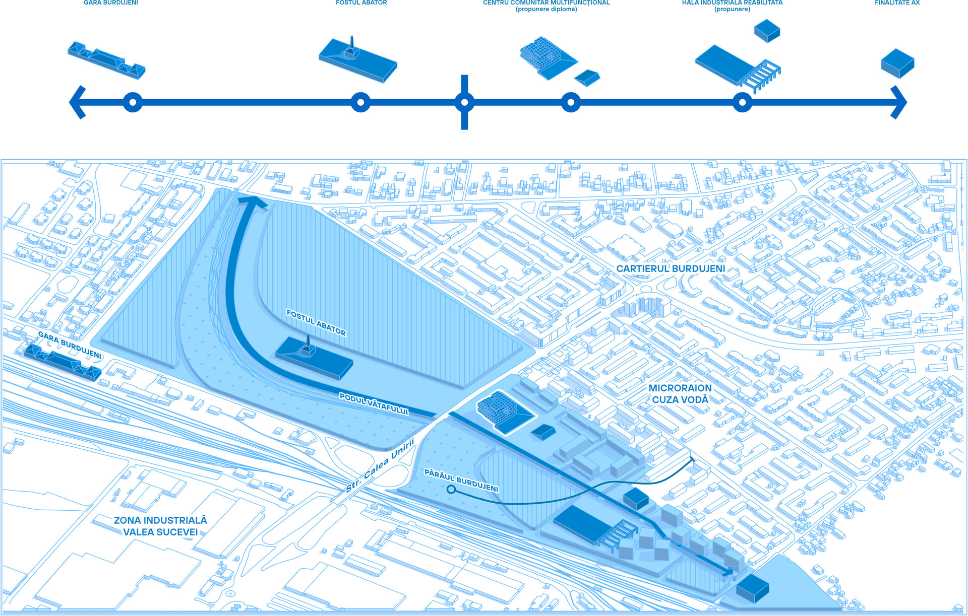 Tema proiectului pornește dintr-o realitate urbană marcată de lipsa unei planificări coerente și de evoluția haotică a țesutului construit. În ultimele decenii, dezvoltările orașelor s-au concentrat pe ansambluri mari și pe extinderea periferică, generând fenomenul de urban sprawl și ignorând cartierele existente. În special cele construite înainte de 1990 au fost neglijate, fiind private de intervenții consistente capabile să le actualizeze funcțional și să le integreze în dinamica contemporană. Această lipsă de strategie a dus la perpetuarea unor probleme sociale și la apariția unor dezechilibre în ceea ce privește calitatea vieții. Totuși, aceste cartiere reprezintă o resursă urbană semnificativă și oferă oportunitatea de a deveni platforme pentru o dezvoltare coerentă, atât pe plan social, cât și pe plan economic și cultural.