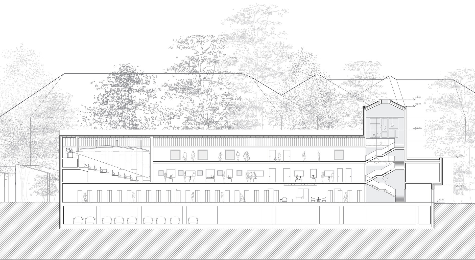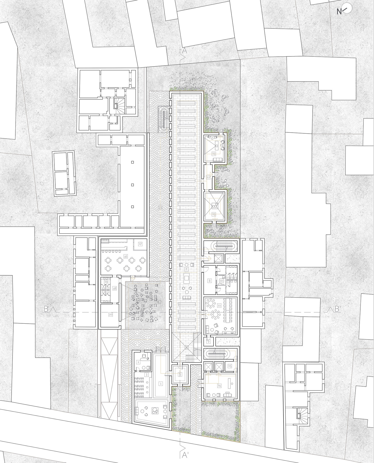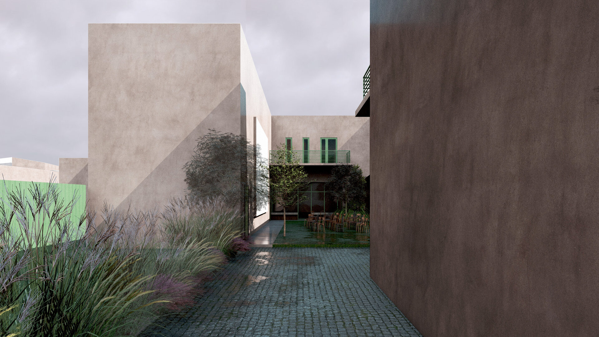 Demersul arhitectural își propune nu o inserție autoritară, ci una discretă, care împrumută morfologia vernaculară a zonei: o compoziție dezvoltată în lungul parcelei, inspirată de casele vagon și de succesiunea curților intime. Spațiile interioare ale clădirii sunt gândite pentru a sprijini activ comunitatea artistică locală și studenții: o videotecă și o bibliotecă la parter, mici săli de proiecție, spații de expoziție temporară și, mai ales, o “sală a orașului” la etaj, un spațiu versatil dedicat întâlnirilor, proiecțiilor, repetițiilor și dialogului public. Această funcțiune a rezultat din discuții directe cu studenți ai UNATC, care resimt acut lipsa unor astfel de locuri de studiu și expresie.