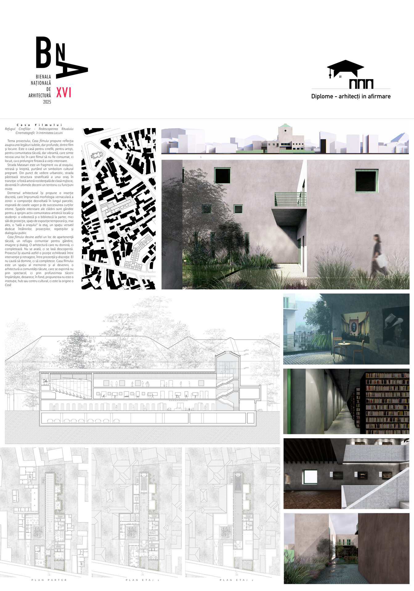 Casa filmului devine astfel un loc de apartenență tăcută, un refugiu comunitar pentru gândire, imagine și dialog. O arhitectură care nu domină, ci completează. Nu se arată, ci se lasă descoperită. Proiectul își asumă astfel o poziție echilibrată între intervenție și retragere, între prezență și discreție. El nu caută să domine, ci să completeze. Casa filmului este un spațiu al memoriei și al devenirii, o arhitectură a comunității tăcute, care se exprimă nu prin spectacol, ci prin profunzimea tăcerii împărtășite, deoarece, în fond, propunerea nu este o instituție, hub sau centru cultural, ci este la origine o Casă.