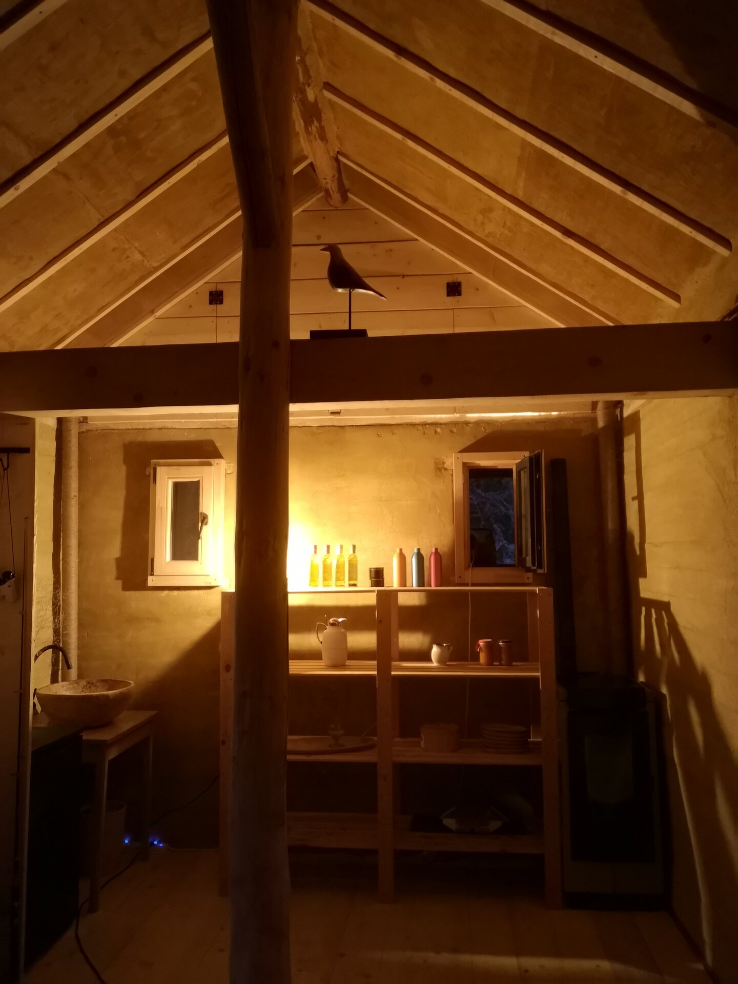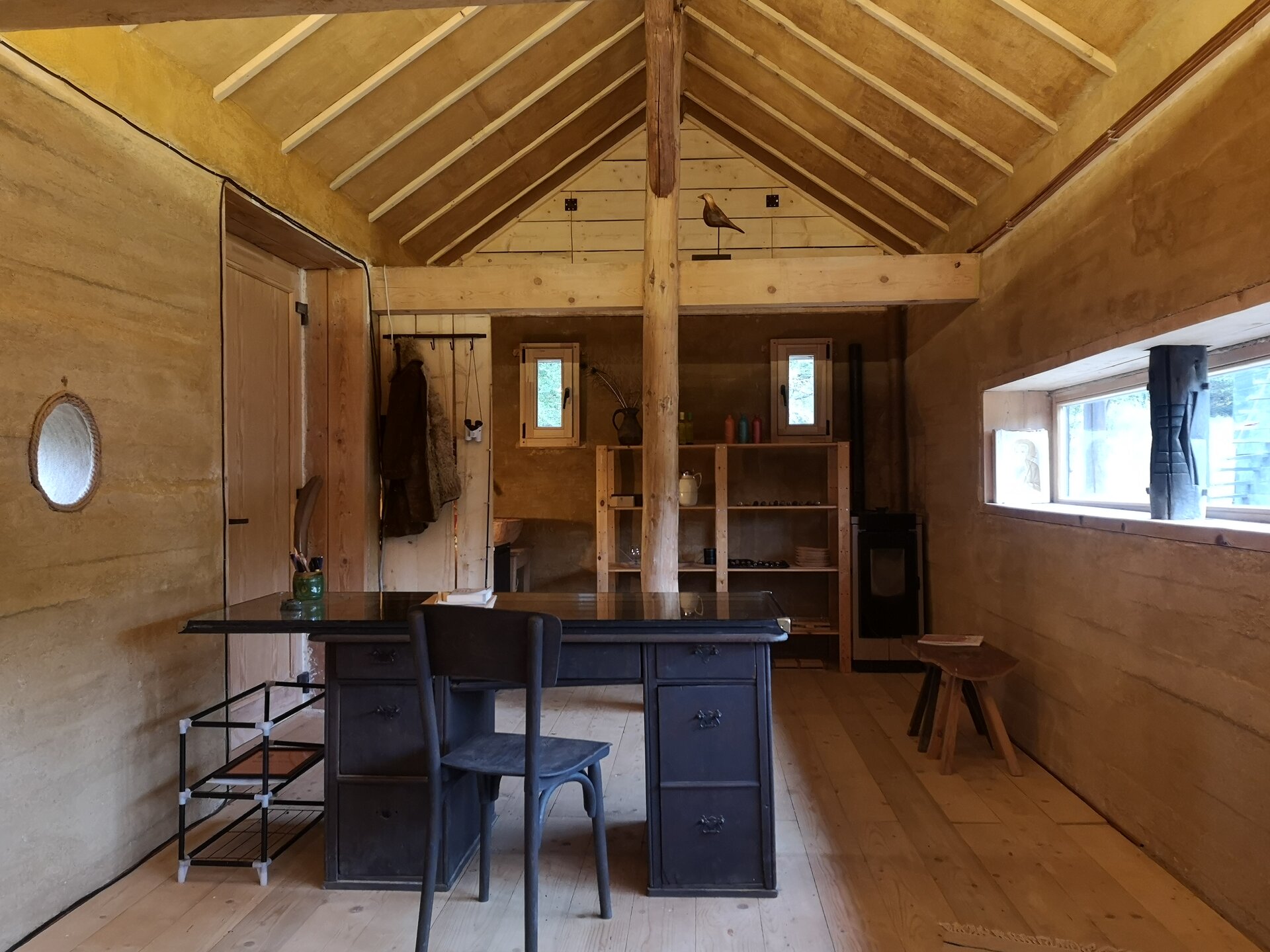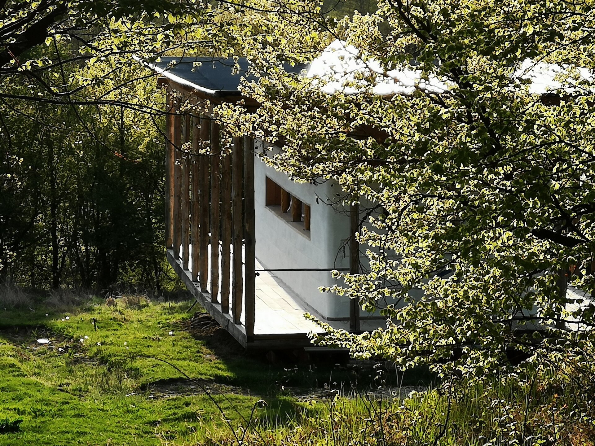 O locuință lacustră pe o insulă uscată, întrucât am săpat un drenaj perimetral pentru a proteja fundațiile din bile arse. Pentru această clădire cu două niveluri am folosit două tipuri de lemn: trunchiuri de salcâm pentru subsol și lemn de brad pentru piano nobile. Am adaptat și reinventat pe șantier îmbinări lemn pe lemn pentru a defini elementele portante și pentru a rigidiza structura, care este complet liberă, plutind deasupra solului.
