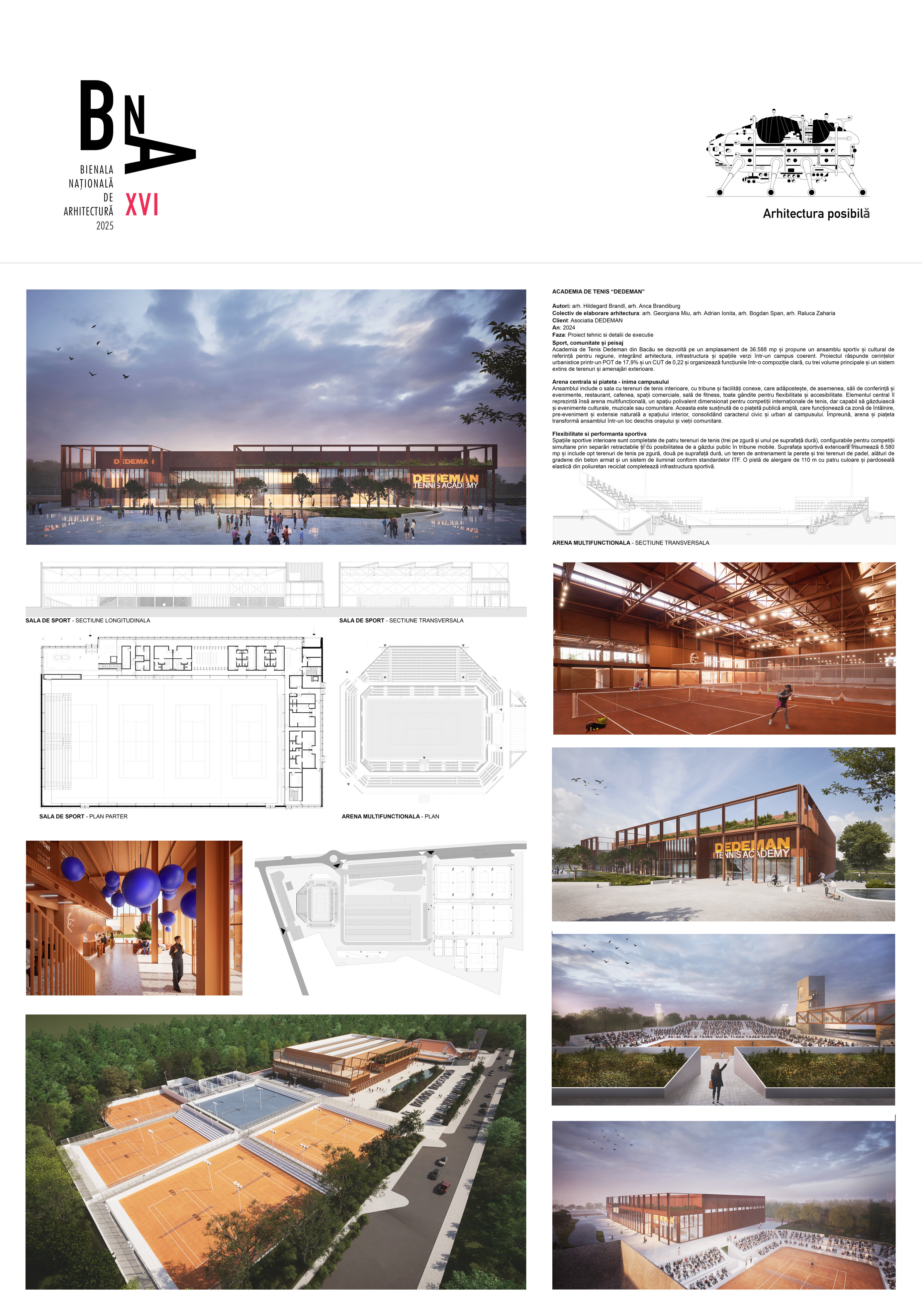 Academia de Tenis Dedeman din Bacău se dezvoltă pe un amplasament de 36.588 mp și propune un ansamblu sportiv și cultural de referință pentru regiune, integrând arhitectura, infrastructura și spațiile verzi într-un campus coerent. Proiectul răspunde cerințelor urbanistice printr-un POT de 17,9% și un CUT de 0,22 și organizează funcțiunile într-o compoziție clară, cu trei volume principale și un sistem extins de terenuri și amenajări exterioare.