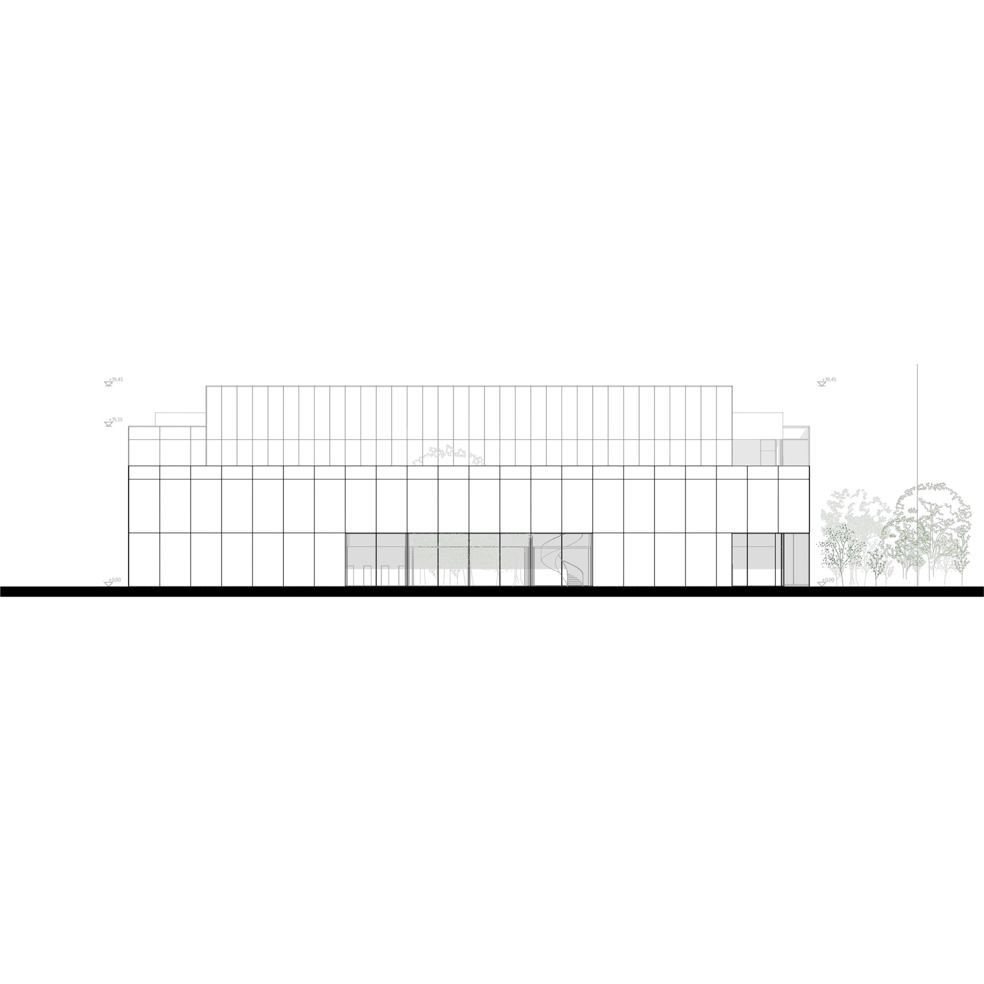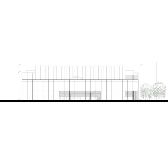 Transparența oferită de materialitatea corpului de legătură, ce găzduiește intrarea angajaților, permite o relație vizuală între stradă și stațiune, ce susține conceptual caracterul de urbanism deschis al zonei.