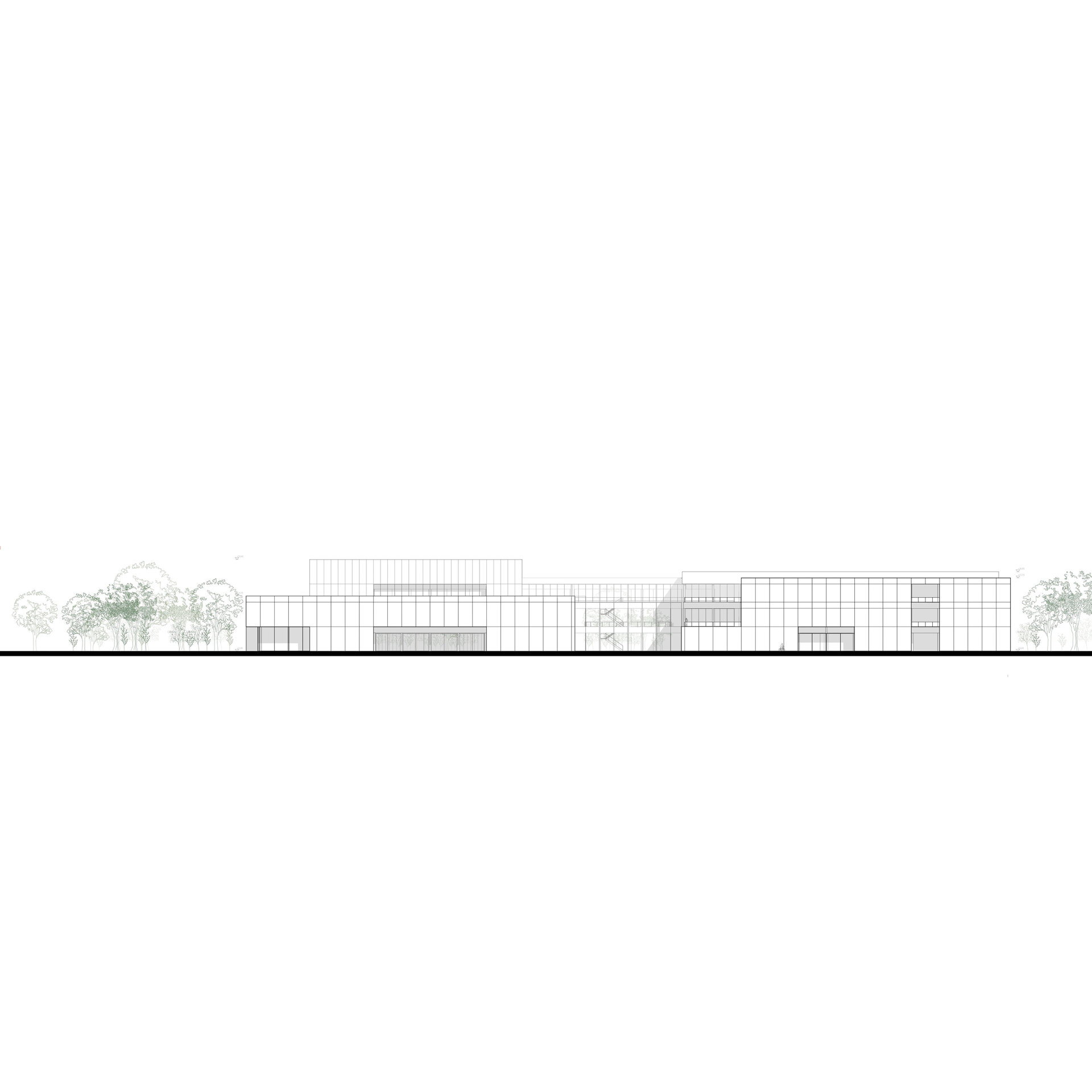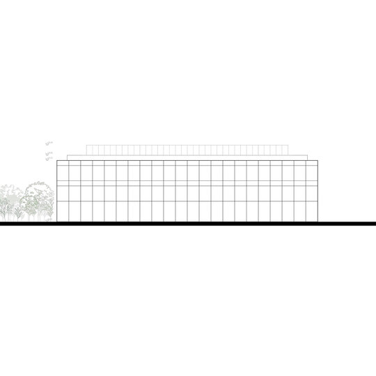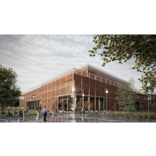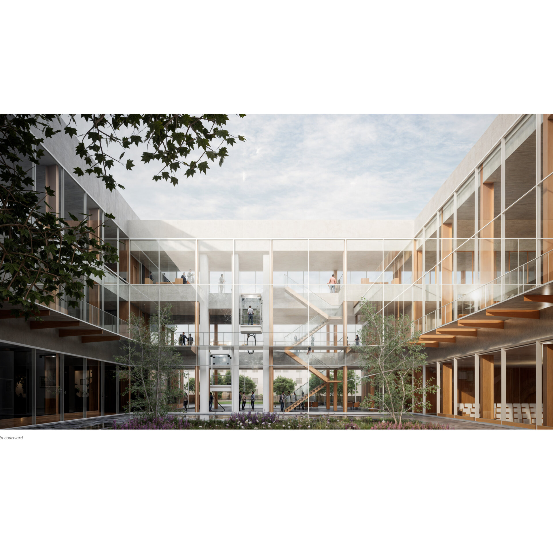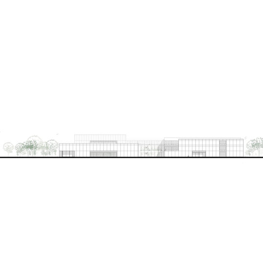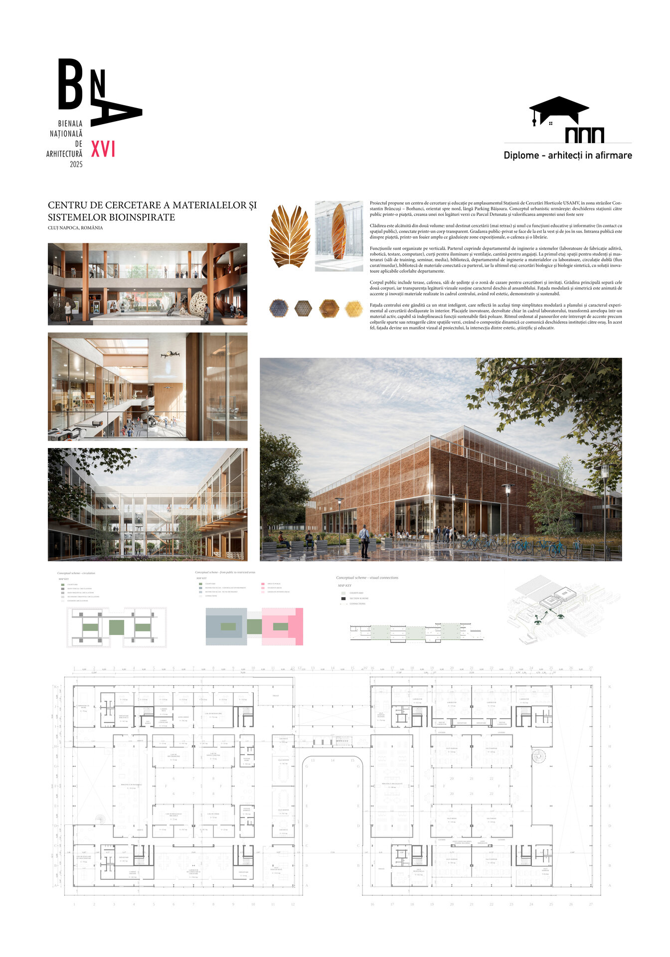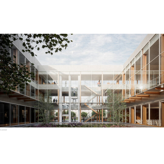 În corpul public, etajul se retrage, făcând loc unei terase mai intime pentru cercetători și viitorii specialiști, care se află în legătură directă cu o cafenea și săli de training și de ședințe. Deasupra se află zona de cazare destinată în special cercetătorilor, dar și doctoranzilor și invitaților/practicanților din-afara orașului. Grădina principală are ca prim rol separarea celor două corpuri.