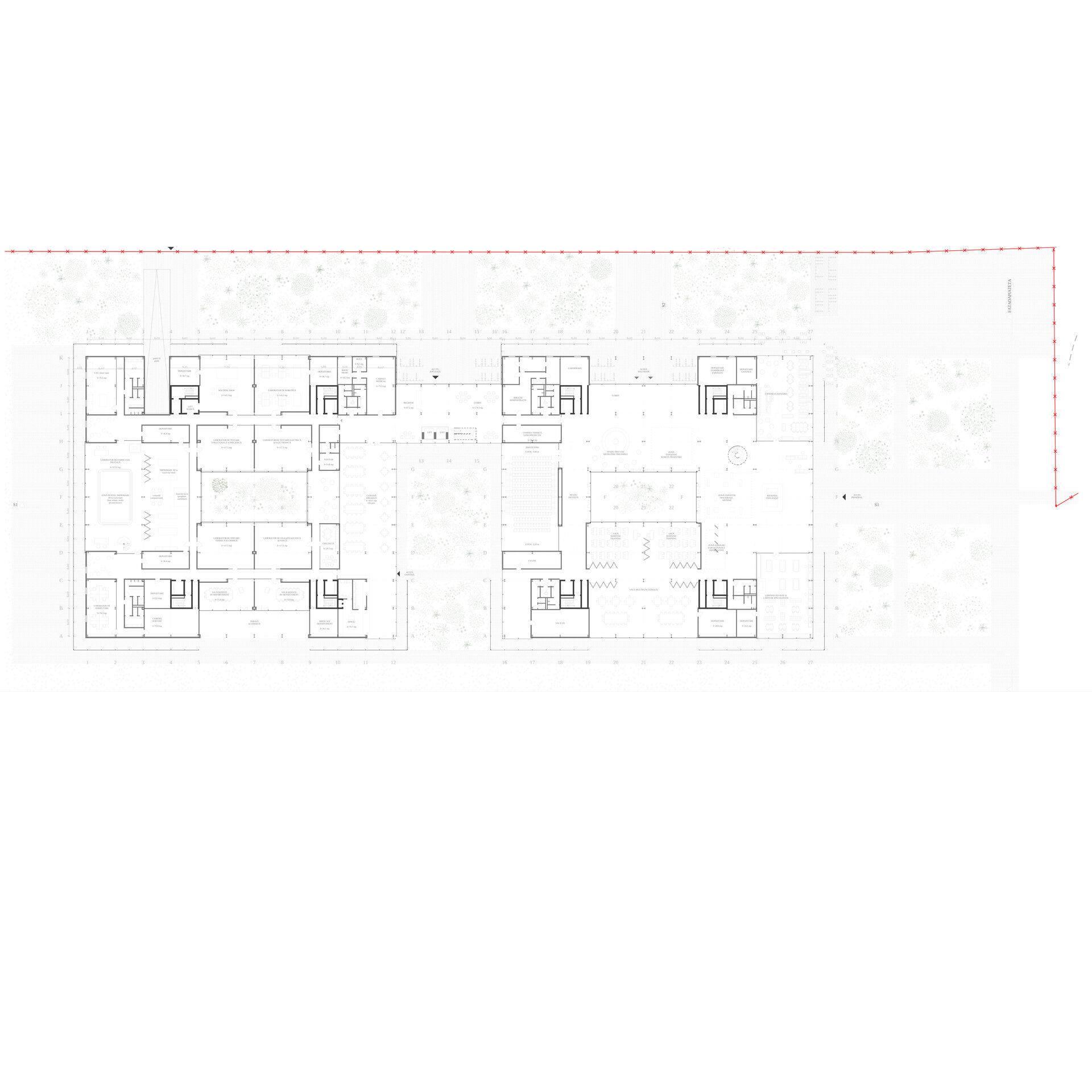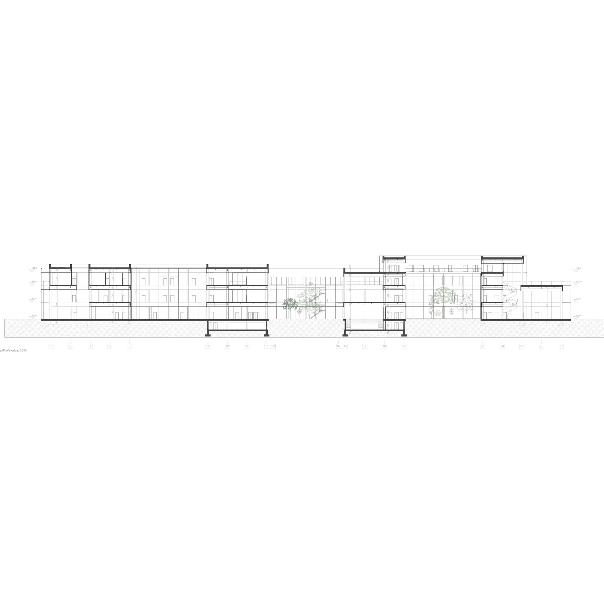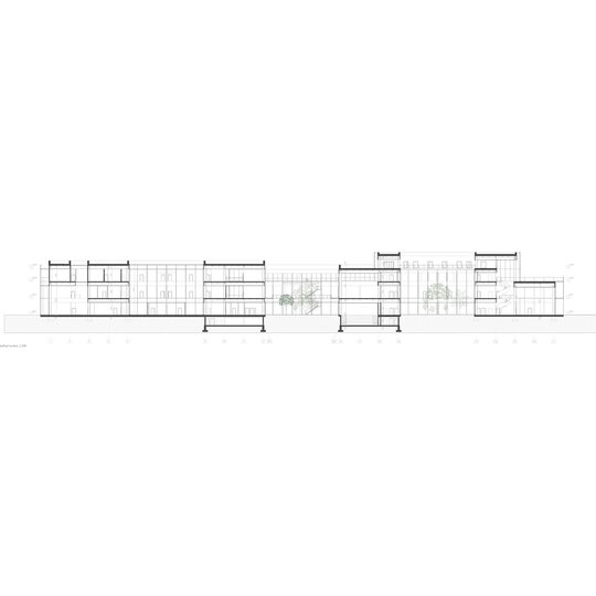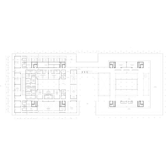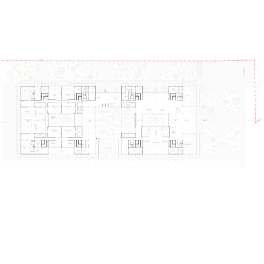Se poate observa schema de circulație clară, cu coridoare ce se alipesc curții, creând zone de pauză sau îndepărtându-se pe latura lungă, lăsând loc funcțiunilor să beneficieze de lumină naturală.