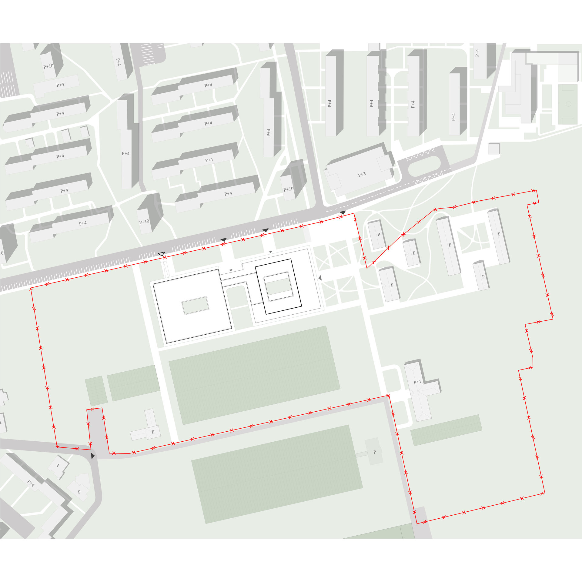 Curțile au, în primull rând, rol sustenabil de ventilare a fațadelor și iluminare prin forma lor strategică, ținând cont de unghiul razelor de-a lungul zilei - curțile se alungesc pe laturile N-S și se îngustează pe E-V.