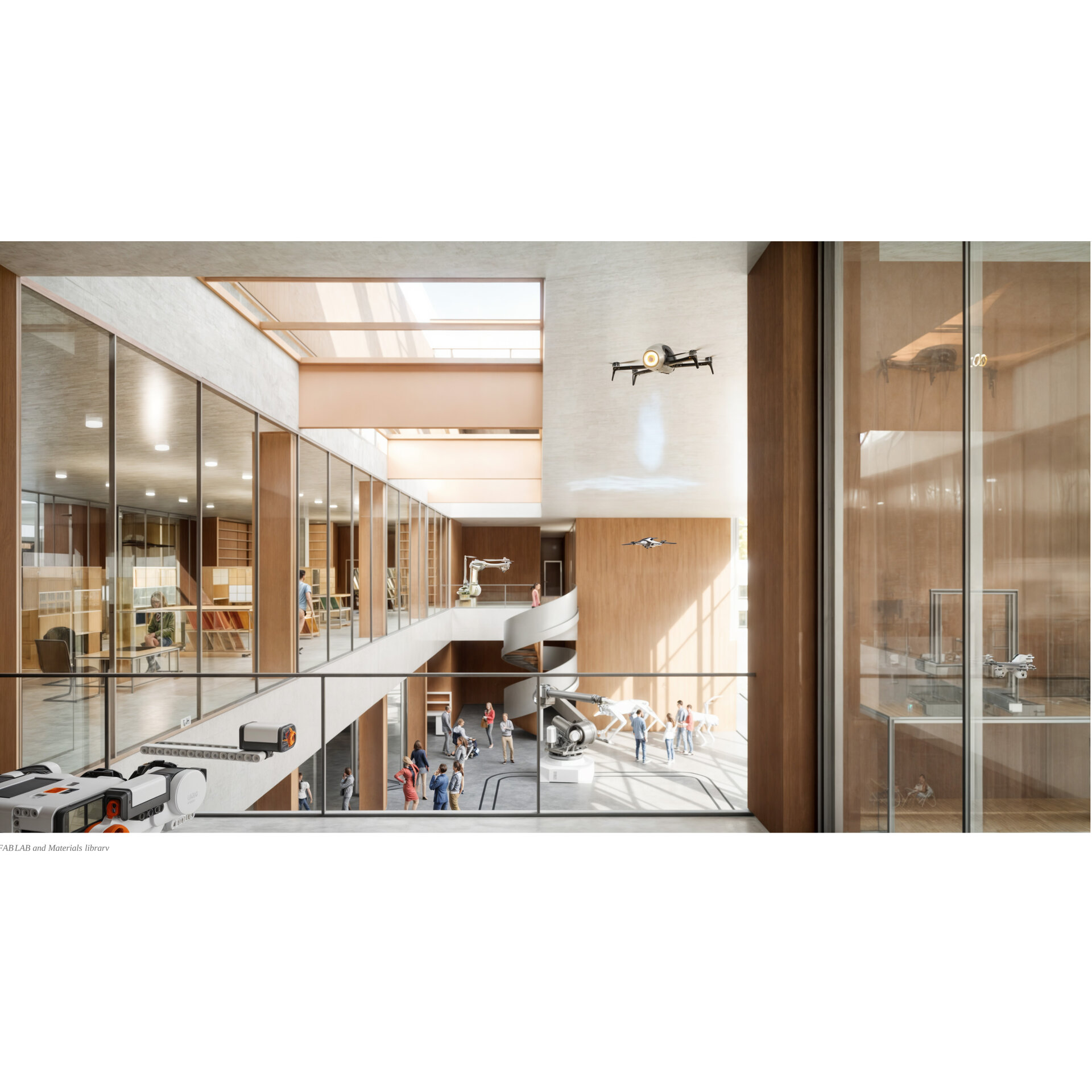 În interiorul departamentului este și o bibliotecă de materiale, care comunică pe verticală cu laboratorul de fabricație de la parter printr-o scară elicoidală și o pratformă hidraulică.
