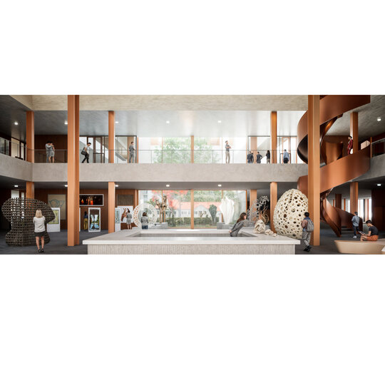 Clădirea centrului se împarte în 2 volume conectate: unul destinat cercetării, mai retras, și celălalt cu scop informativ și educativ, în contact cu spațiul public.